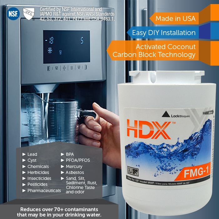 This premium HDX replacement refrigerator water filter fits in place of GE Filter model MWF. Certified against NSF/ANSI 42, 53, 372, 401 & CSA B483.1 to reduce Lead, Cyst, VOC's, BPA, PFOA & PFOS as well as Chlorine taste and odor to ensure high quality and performance. This economical filter will deliver fresh, crisp, clean tasting water and ice cubes that you can trust for your family. Engineered with the power of 0.5 Micron coconut shell carbon block, this filter provides tremendous capacity to reduce impurities, sediment and rust that may be present in your drinking water. The carbon block has millions of active sites on its surface and within the structure which can absorb impurities like a sponge and can hold other types of impurities on its surface like a magnet. Additionally, this filter can catalytically breakdown other impurities similar to the way a catalytic converter works in your automobile. These processes ensure that you are receiving the cleanest and best tasting water possible for you and your family. Easy DIY installation filter with a life capacity of 300 Gal. or 6 months, whichever precedes. Using this filter will replace 1500 water bottles reducing the amount of plastic waste in our landfills. This filter fits the following GE filter models: MWF, GWF, MWFA, GWFA, GWF06, Kenmore filter: 46-9991, Hotpoint filters: HWF, HWFA.